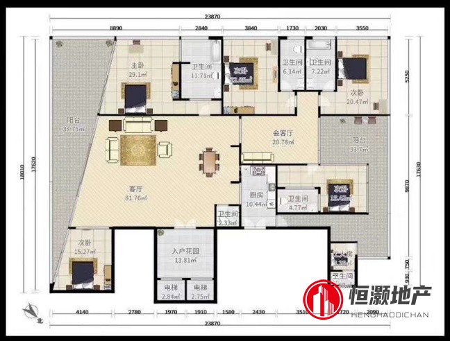 户型:4套房 +2房+1保姆房+3厅 +6卫双阳台,客厅81平,中西厨房,超大阳台